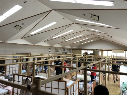 真備町老人ホームの避難所に、間仕切り設置のボランティアに参加しました。